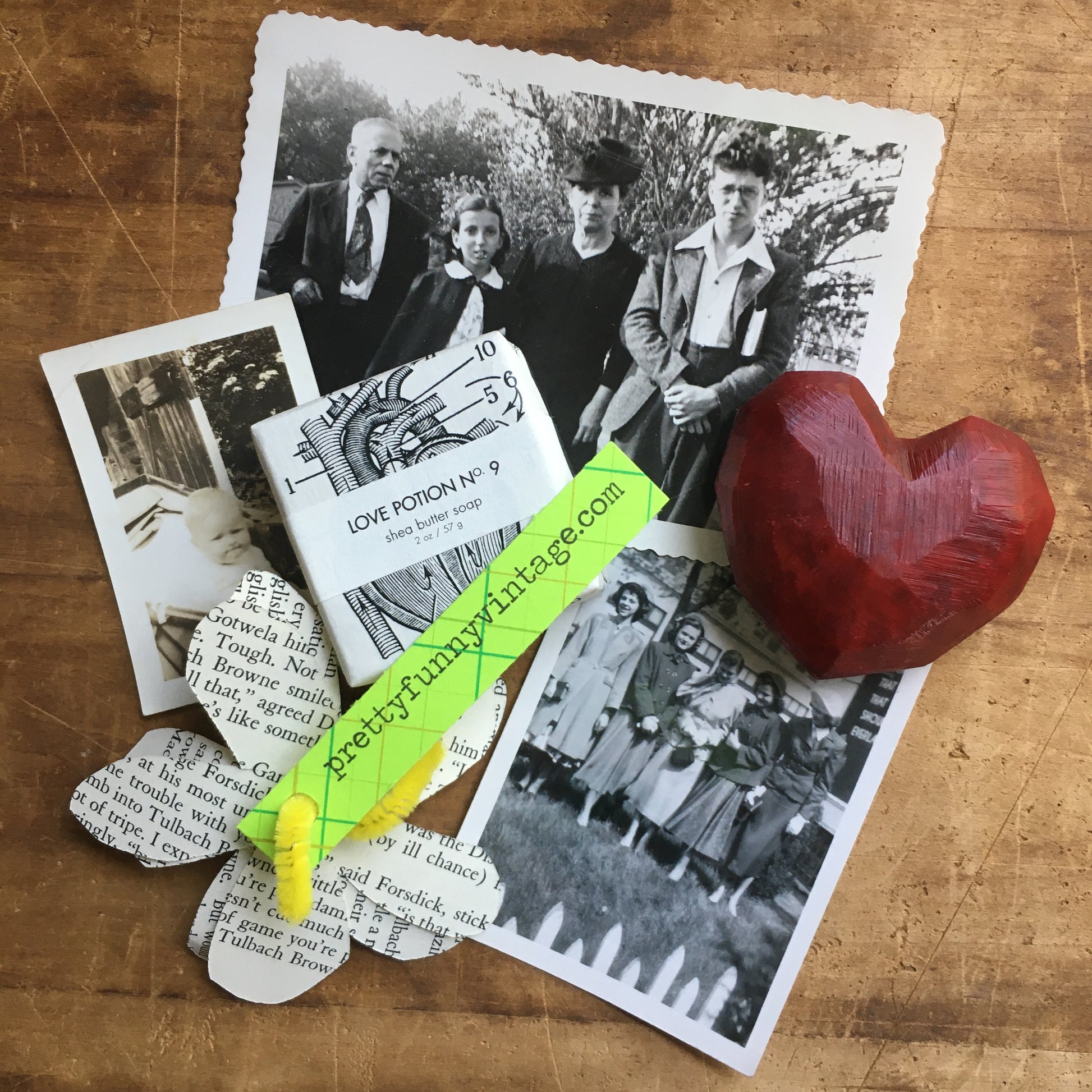 *Each care package will have a random assortment of 3 vintage photograph peeps, and each soapstone heart will have slight marking variations*