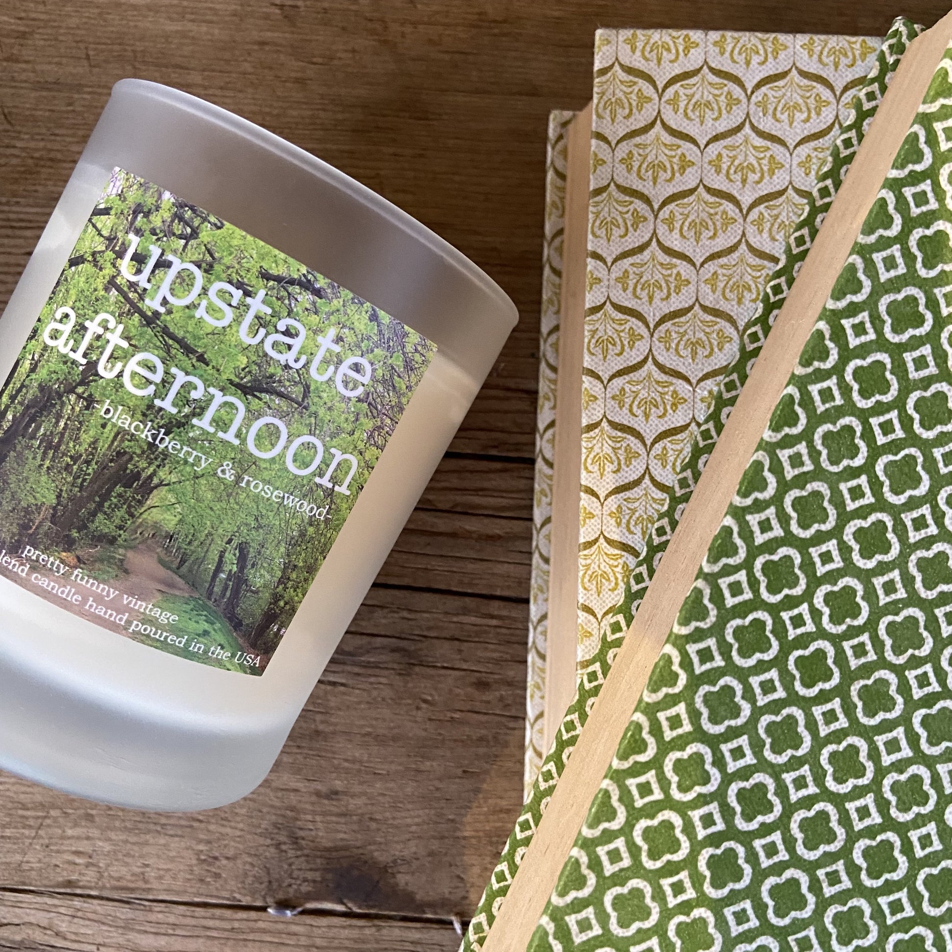 "Upstate Afternoon" is our bestselling exclusive signature candle. It is hand poured in the USA and has a beautifully rich scent of blackberry and rosewood.