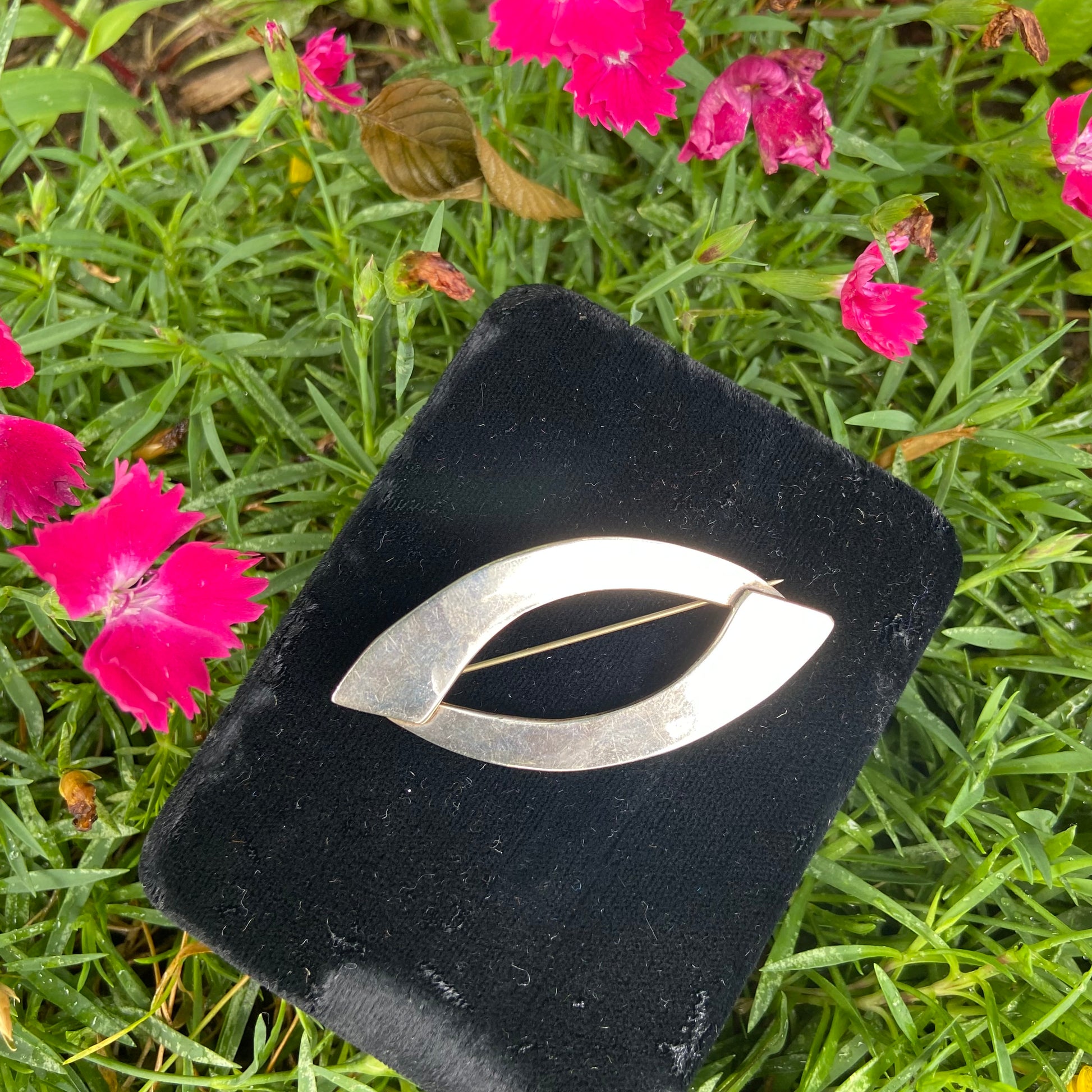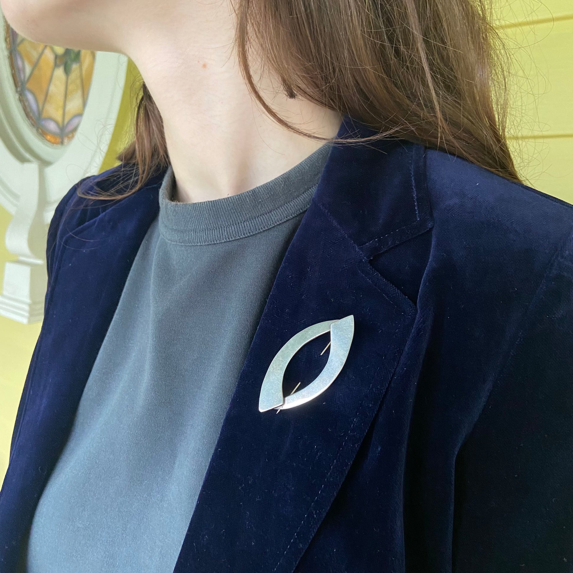 This vintage modernist sterling brooch would be the perfect addition to any top. It’s marked “Mexico 925” on the back and is in beautiful condition.